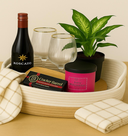A stylish khaki‑and‑white cotton‑rope storage basket (like the Sawsysine set above) is filled with your chosen items. Inside, you’ll find: